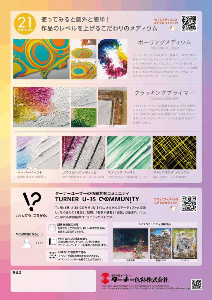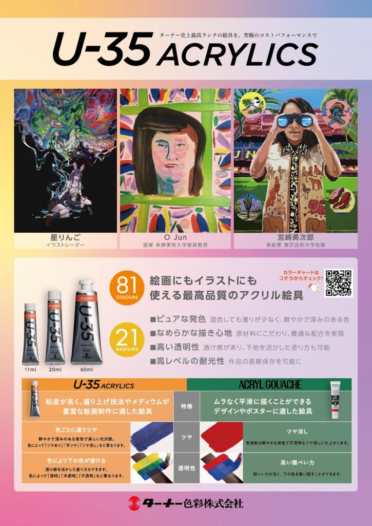 ターナー色彩「U-35」チラシ掲載 ターナー色彩様の画材「U-35」のチラシに、絵を掲載していただきました。いつも愛用している画材のチラシに載せていただき大変光栄でした。 公開日2023/12/19クライアントターナー色彩株式会社様内容イラスト